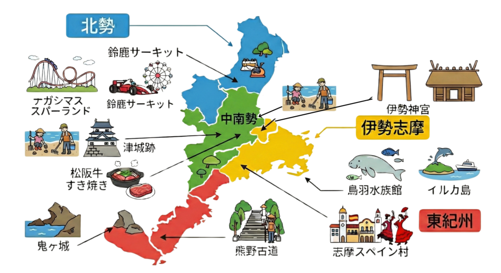 A1. 伊勢志摩エリアは伊勢神宮やおかげ横丁、鳥羽水族館など定番スポットが充実。湯の山温泉やナガシマスパーランド周辺も温泉・遊園地など幅広い楽しみ方があります。